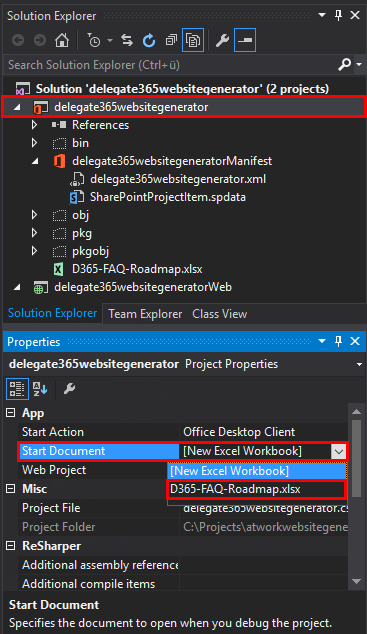 Then, change the “Start Document” property of the Office App project to your file (which now shows up below [New Excel Workbook]).