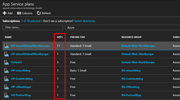 I reduced the Apps into 3 App Service Plans that are not in the “Free” ricing tier and they contain one or more websites, for example the first plan hosts 11 Apps that are running in North Europe. The other App Service Plans may contain only 1 App, but are “free”.