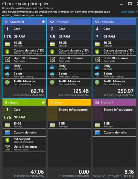 Later, I also integrated the “HP-atworkblog” (“HP” was for “Hosting Plan”, before we renamed that to “App Plan”) into the first App Service Plan as well… So now I have only 2 App Service Plans that cost money, one in North Europe and one in West Europe.As mentioned above, the limits of an Azure Service Plan are valid for the sum of all Apps. So, for example, pricing tier “S1” offers the resources defined below and can store up to 50GB for all Apps in that plan. Should be enough for standard websites…