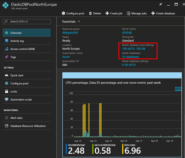 An Elastic Database Pool can store many SQL databases. This is extremely helpful for many small SQL databases, which is often the case when hosting websites. In this sample you see that there’s one pool with the resources of 100 eDTU’s, in total 100GB size, and there are 53 databases running in that pool – with dynamic and automatic resource-optimization. Cool!