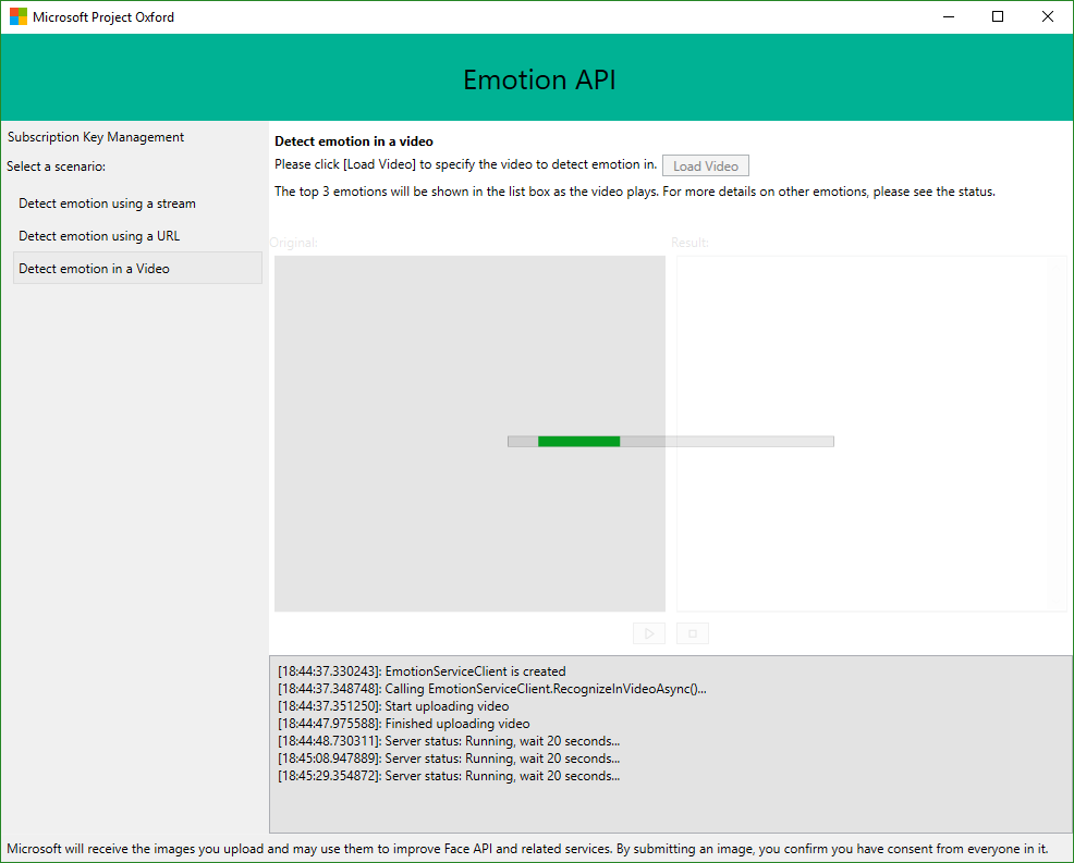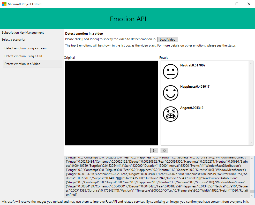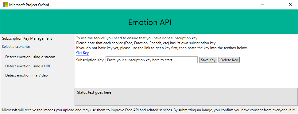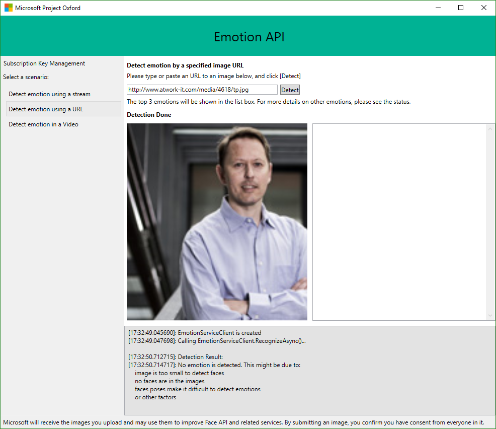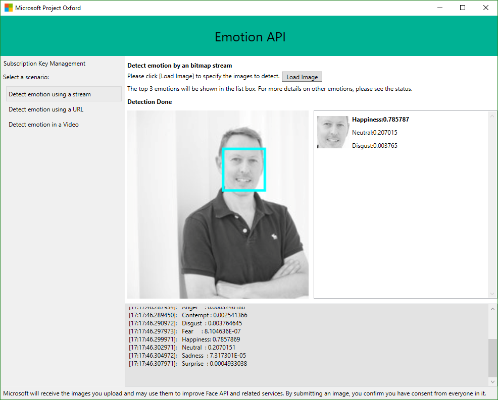 Hier wird also zunächst der eigene “Emotion-Preview” Key benötigt. Diesen erhält man von https://www.microsoft.com/cognitive-services/en-us/subscriptions. Der kostenfrei Key kann für 30,000 transactions per month und 20-mal pro Minute verwendet werden. Diesen kopiert man und trägt in hier in das Subscription Key Feld ein und klickt auf Save Key. Damit wird der eigene Key auf die eigene Festplatte gespeichert und steht für die Zukunft in dieser App bereit.