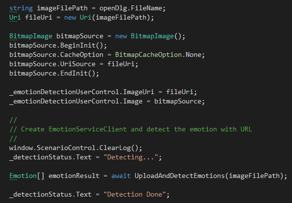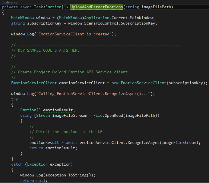 …hier folgt dann die UploadAndDetectEmotions Methode mit dem Client (SDK) in DetectEmotionUsingStreamPage.xaml.cs. Diese erzeugt den Client mit dem Subscription Key und lädt das Bild in das Service.