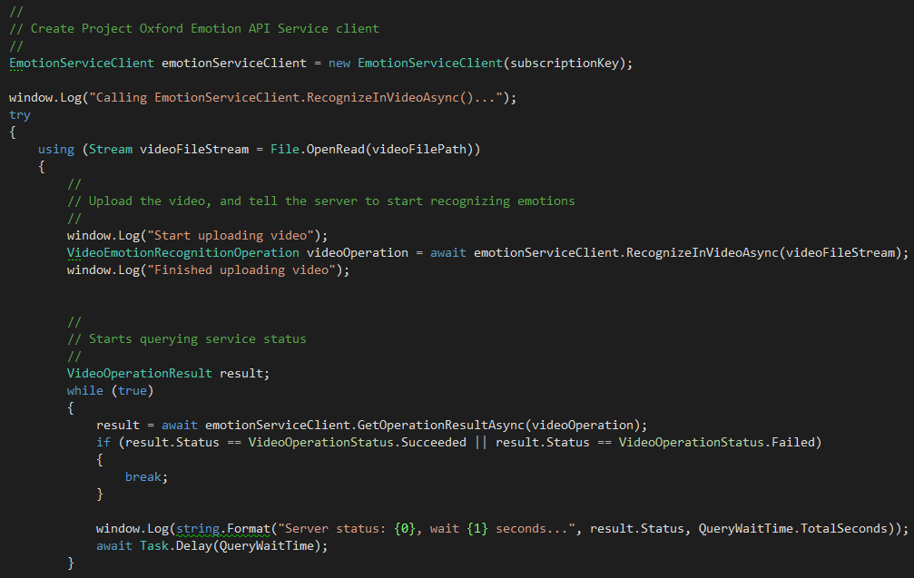 Hierbei muss das Videofile als .mp4, .mov oder .wmv File auf der Festplatte vorliegen. Dieses wird nach der Auswahl zur Analyse an die Emotion API upgeloadet. Das Ergebnis wird in EmotionDetectionUsingVideoPage.xaml.cs von der async-Methode emotionServiceClient.GetOperationResultAsync(videoOperation) geliefert.