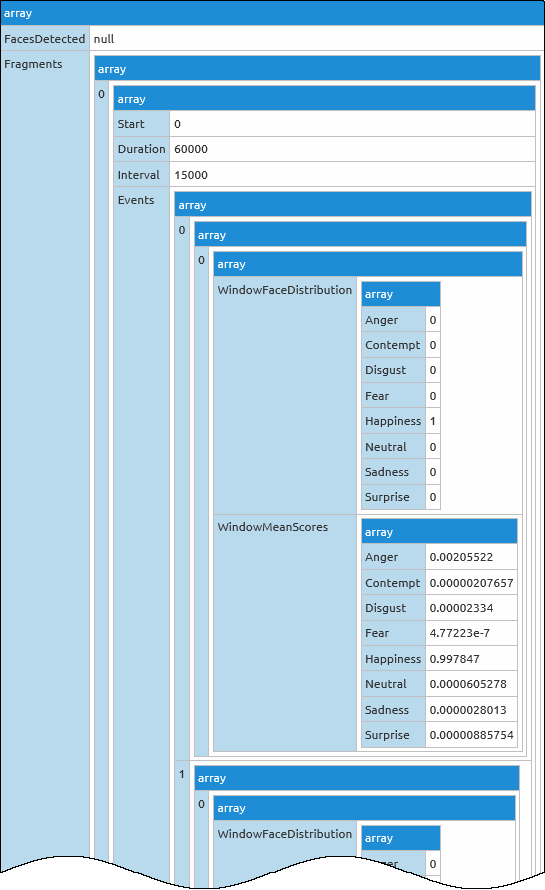 Hier der JSON-Output des ersten Gesichtsausdrucks (offensichtlich der Ausdruck “Happy”, visualisiert mit jsonvisualizer.com):