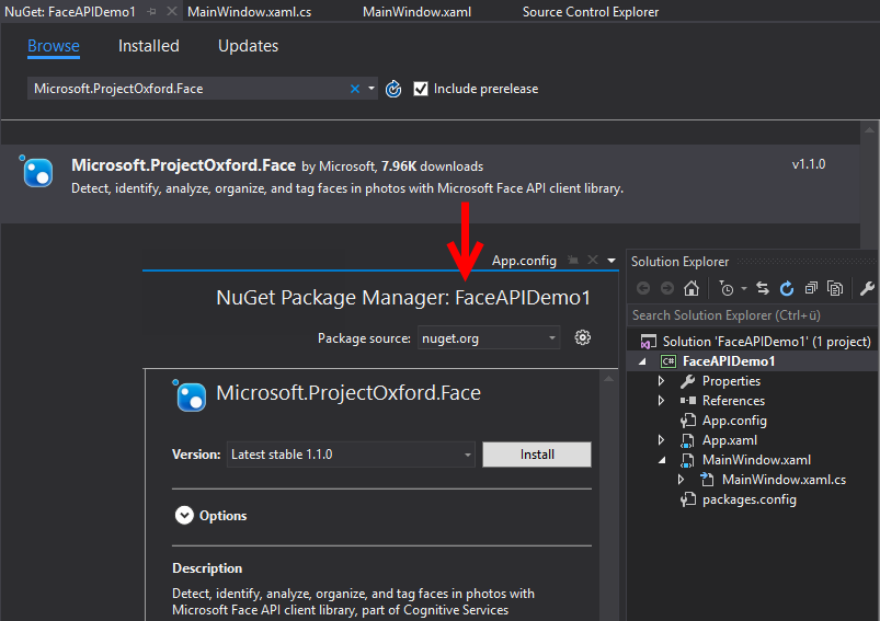 Für die .NET Plattform gibt es zur einfacheren Nutzung Client Libraries, um die Web-Requests einzukapseln und um das Service bequemer zu verwenden. In Schritt 3 wird nun die Client-Library “Microsoft.Project Oxford.Face” über NuGet wie folgt bezogen.