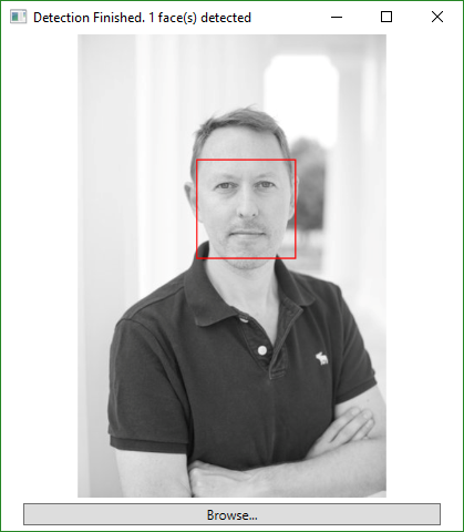 In Schritt 5 des Tutorials wird die ButtonClick Methode async und das Ergebnis ausgewertet. Dabei wird pro erkanntem Gesicht ein rotes Rechteck über die Position gezeichnet. Dazu habe ich ein Schwarz/Weiß-Foto von mir verwendet, das Beispiel zeigt den Output.