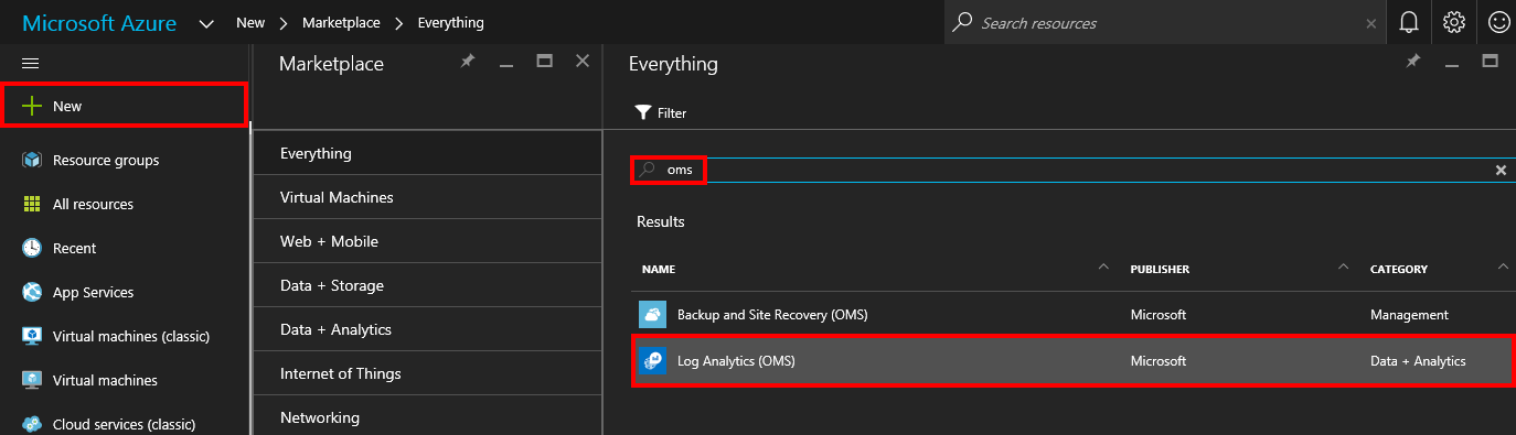 Login to the Azure Resource Manager portal https://portal.azure.com and click New. Search for “oms” and select “Log Analytics (OMS)” as follows.