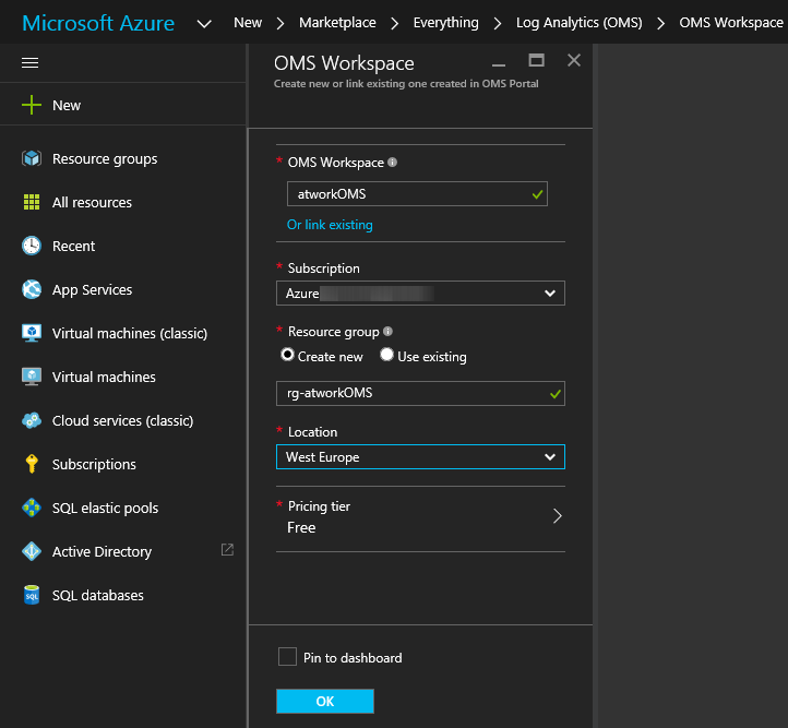 When the description blade “Log Analytics (OMS) follows, click Create on the bottom. Now fill out the OMS workspace data, resource group, location an plan…