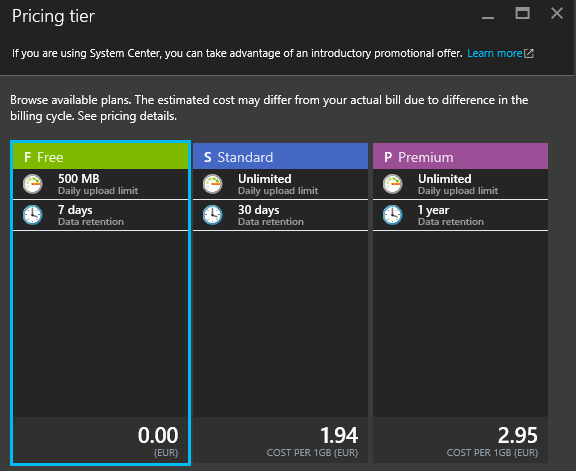 The Pricing tier can be changed in the configuration panel. Basically, the OMS service offers a free plan which is usually good enough for starting. The plan can be changed anytime. See the features and pricing below: