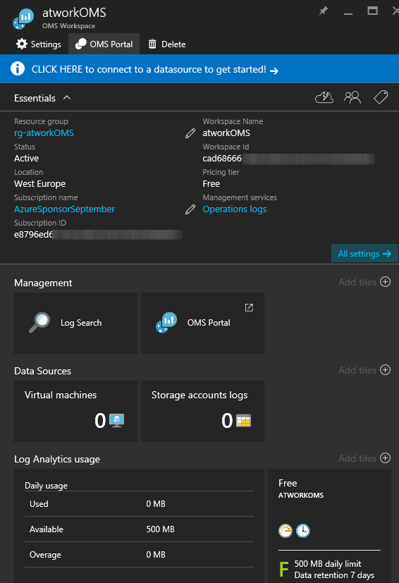 Be warned: If you have this Office 365 subscription already connected to another OMS workspace, the config doesn’t allow to bind the Office 365 tenant more than once (“This subscription is already linked to another OMS workspace. Please select a subscription that is not yet linked to an OMS workspace. Please close this window to continue.”).