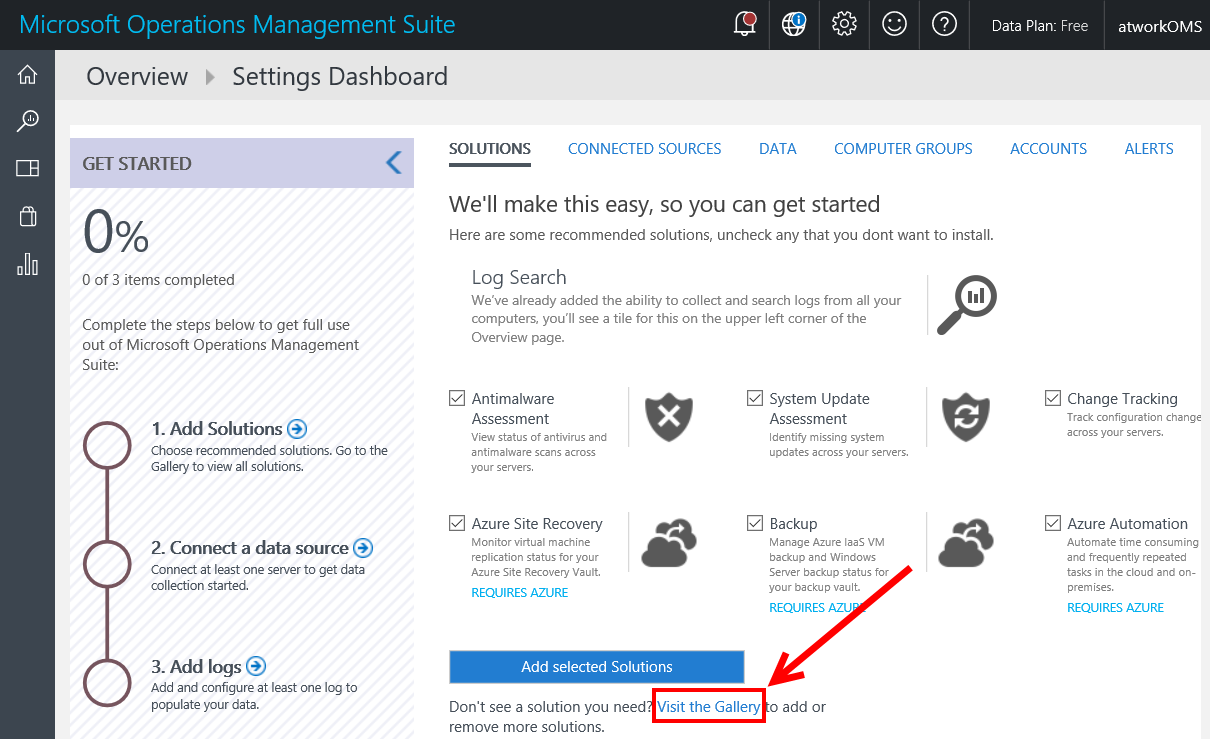 In the OMS Portal, click Settings. In the Settings Dashboard, click the “Visit the Gallery” link on the bottom.