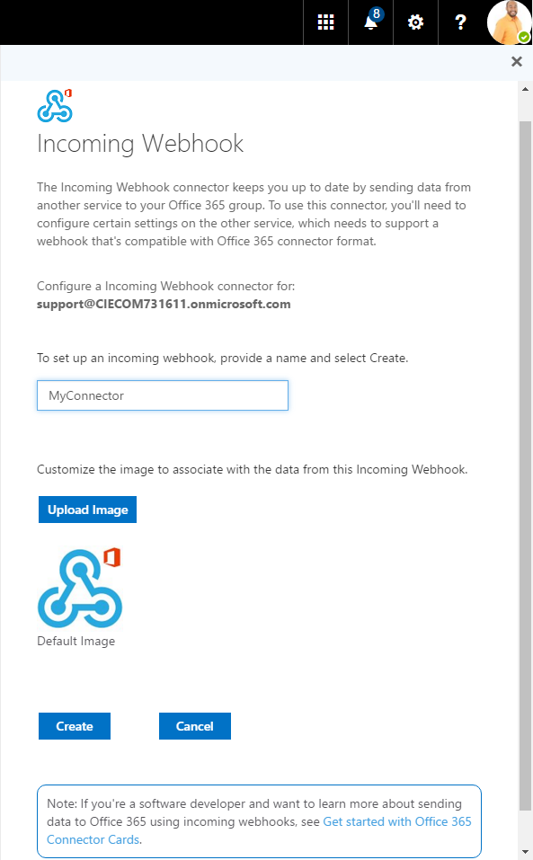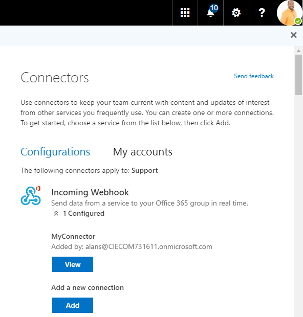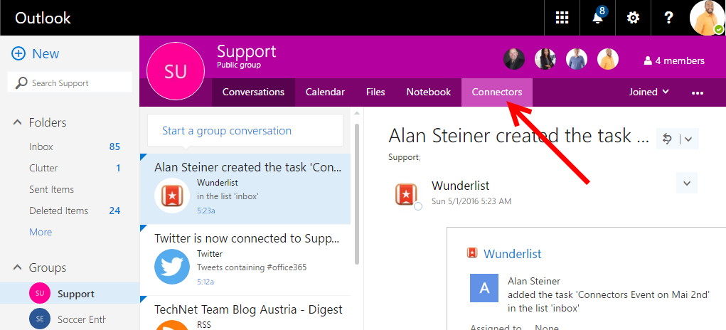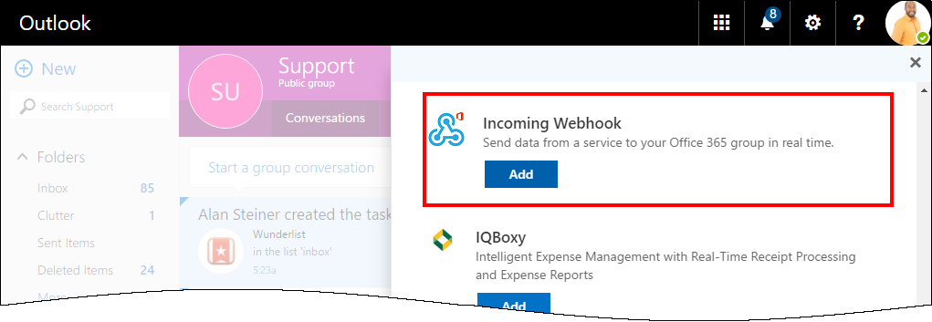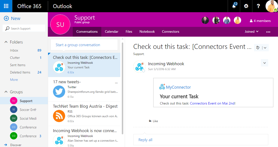 Der erste Schritt ist das Erstellen des Webhooks in einer Office 365 Group. Das klappt vorerst nur in Outlook for the Web (oder programmatisch). In Outlook for the Desktop kommt diese Funktionalität nach.