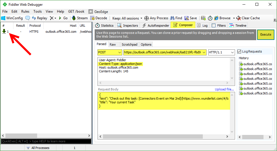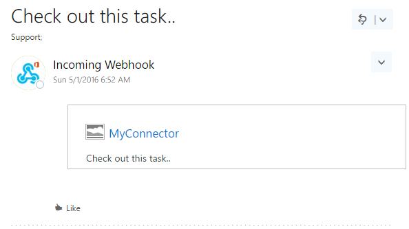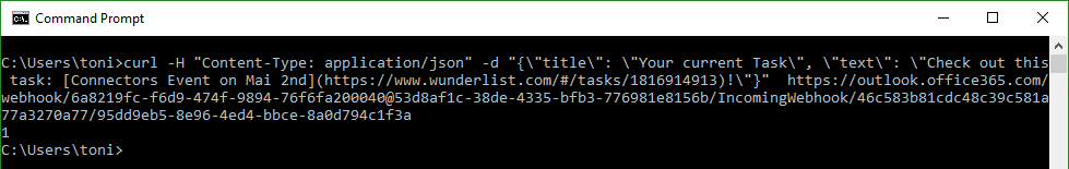 curl -H "Content-Type: application/json" -d "{\"title\": \"Your current Task\", \"text\": \"Check out this task: [Connectors Event on Mai 2nd]([https://www.wunderlist.com/#/tasks/1816914913)!\"}"](https://www.wunderlist.com/#/tasks/1816914913)!\"}") [https://outlook.office365.com/webhook/6a8219fc…/IncomingWebhook/46c583b81cd…](https://outlook.office365.com/webhook/6a8219fc…/incomingwebhook/46c583b81cd)