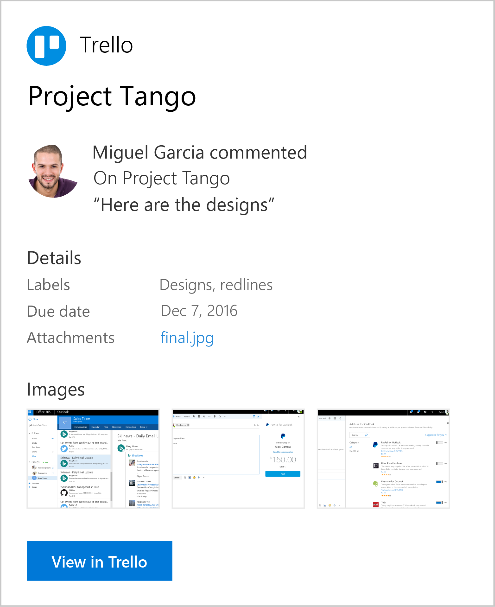 Neben reinem Text und Links können auch Buttons “potentialAction” und Grafiken “images” gesendet werden. Das vollständige Format der Connector Card wird in Office 365 Connectors API Reference beschrieben. Das Ergebnis des umfangreicheren JSON-Textes könnte auch so wie in dem Artikel aussehen: