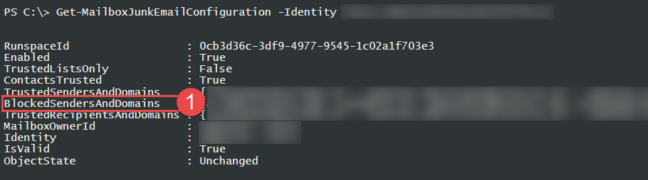 Wir haben zwar im ersten Step schon gelernt, dass eine Serverseitige Spam-Erkennung nicht zugeschlagen hat, aber zur Sicherheit überprüfen wir noch die Junk-Mail Configuration des Users. Dies wird mit dem Powershell CmdLet Get-MailboxJunkEmailConfiguration überprüft.