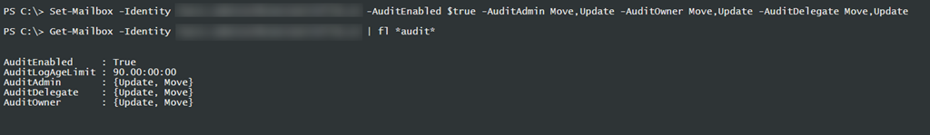 Das Audit Logging wird auf der individuellen Mailbox aktiviert. Mit dem Powershell Befehl Set-Mailbox und dem Audit Parametern setzt man dass “move” Operationen für Owner, Delegate oder Administrator auditiert werden sollen. Tun wir das doch einfach mal.