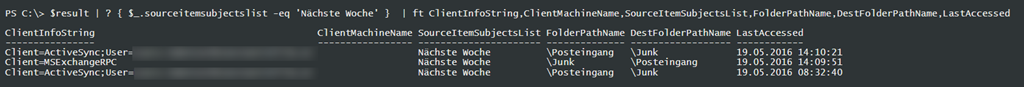 Search-MailboxAuditLog -ShowDetails -Identity [irgendwer@domain.com](mailto:irgendwer@domain.com) -StartDate (get-date).AddDays(-1) -EndDate (Get-Date).AddDays(1) -Operations move