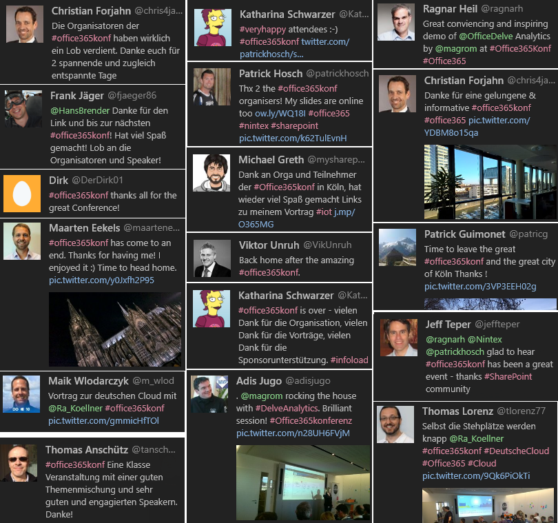 See a Twitter Statistics with the hashtag #Office365Konf in #Office365Konf 2016 Twitter Statistics and some impressions in this graphics.
