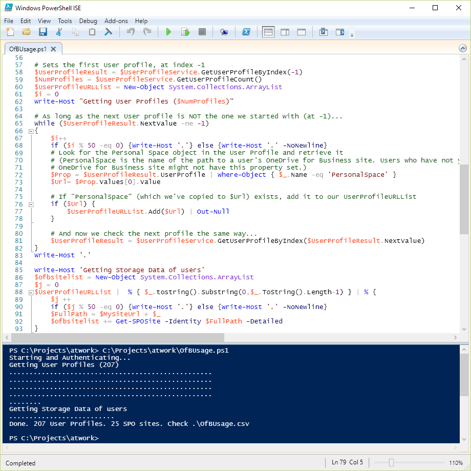 Zuerst werden die Userprofiles im Tenant ermittelt und in einer ArrayList $UserProfileURLList gespeichert. Dies entspricht etwa dem Original-Script aus TechNet: How to display a list of OneDrive for Business site collections und ist Basis für die weiteren Schritte (unsere Weiterentwicklung).