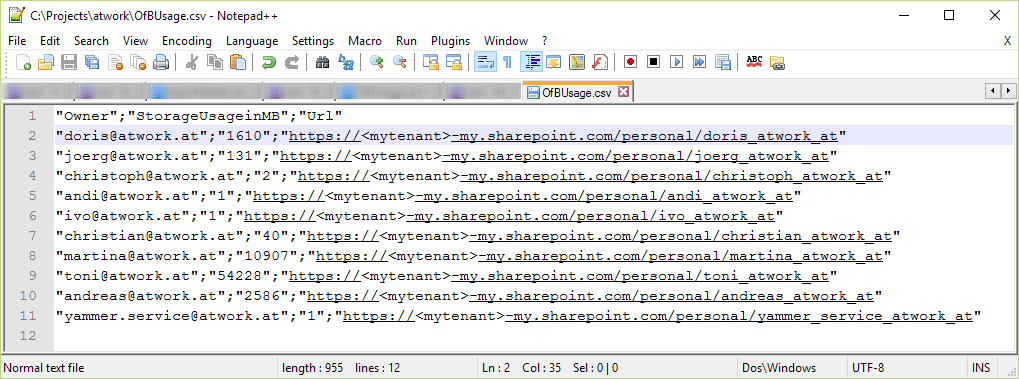 Danach wird diese Liste mit ForEach (das Command “%” ist die Abkürzung dafür und ohne “/” am Ende der URL) durchlaufen mit mit Get-SPOSite abgefragt. Netterweise liefert uns das Cmdlet den Owner und bereits die Anzahl des verwendeten Speicherplatzes in StorageUsageCurrent von SharePoint Online.