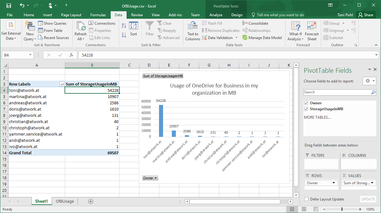Das Pivotieren verrät auf einen Blick, welche Benutzer ihren OfB Speicher am meisten nutzen.