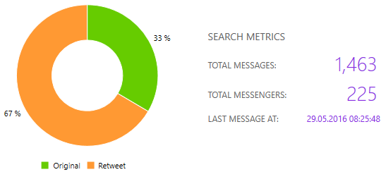 In the last week, since 29th of May 2016 till now (6th of June, 9pm) there have been about 1.500 tweets sent by about 2230 Twitter users. With 33% about one third of the messages have been retweeted.