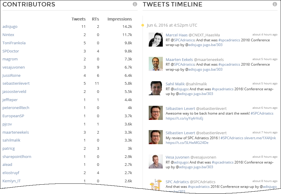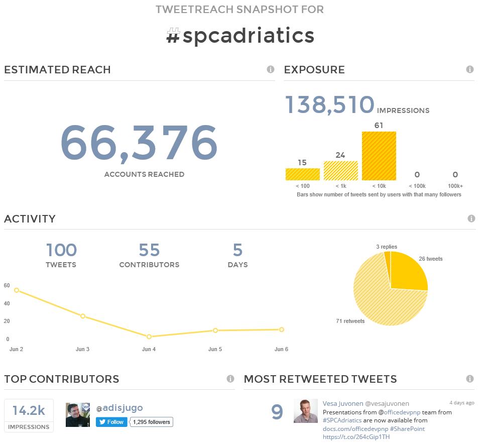 The trends on Twitter were (besides #spcadriatics.): SharePoint, Office365, MicrosoftGraph, AngularJS, CloudKit365, SPDocKit, DisplayTemplates, Office365dev and PowerBI.