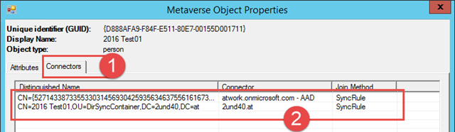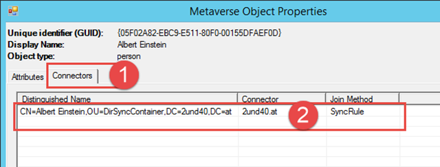 In meinem Beispiel ist der User zu finden. Sollte das nicht so sein, ist der Filter für den Import fehlerhaft. Mein User findet sich in der Liste und die Attribute schauen eigentlich ganz gut aus. Auf dem Tab “Connectors” ist aber etwas seltsam. Der Inbound Connector genannt “2und40.at” liest aus meinem Active Directory, seltsam ist aber, es gibt keinen Outbound Connector.