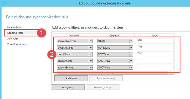 Im Scoping Filter der User Join Rule wird entschieden, ob diese Rule zutrifft oder nicht. Diese Attribute sind verantwortlich ob ein User angelegt wird oder weggefiltert wird. Diese Filter sind auch Default, also da ist nichts customized.