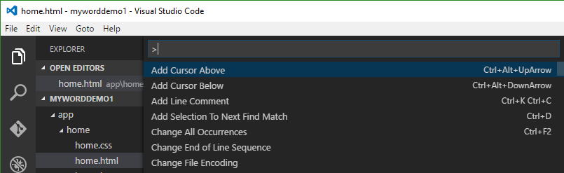 Zuvor noch einen kleinen Exkurs in VSC: Ein sehr wichtiges Feature in VSC ist die “Command Palette”. Diese ist mit Ctrl+Shift+P (oder am PC schneller mit der F1-Taste) jederzeit erreichbar und bietet Zugriff zur ganzen Funktionalitäten von VSC. In der Anzeige wird nach der Eingabe gefiltert. Wenn verfügbar, wird gleich neben der Funktion die entsprechende Tastenkombination angezeigt. Praktisch und schnell!