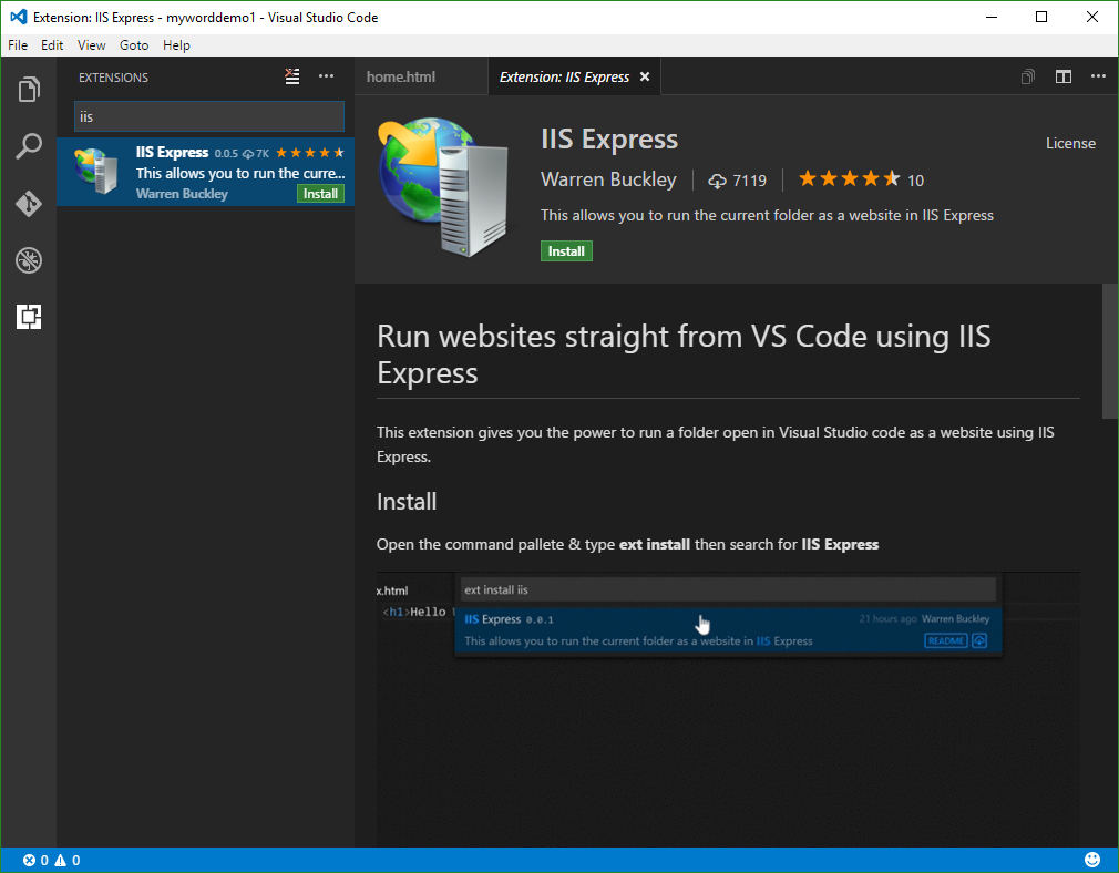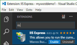 Die Integration wird am einfachsten durch eine weitere Extension zu VSC hinzugefügt. Im Visual Studio Marketplace hat Warren Buckley eine Extension für die Integration von IIS Express bereitgestellt. Danke Warren!