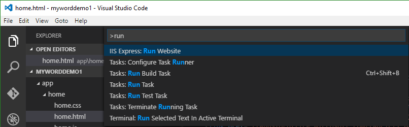 Nach dem VSC Restart wird der IIS Express (für die Website) gestartet: IIS Express: Run Website. Die Suche nach “run” liefert sogleich die Extension.