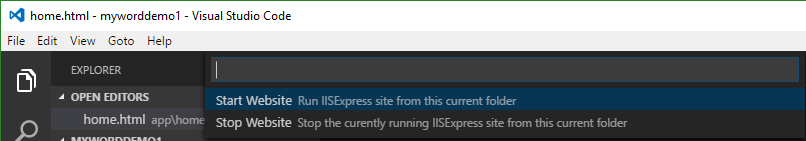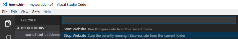 Wer den IIS Express Webserver wieder beenden möchte, führt in der Command Palette IIS Express: Run Website und hier den *Stop Webserver *Befehl aus.