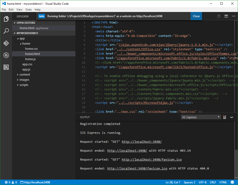 In meinem Beispiel habe ich eine tiefere Ordnerstruktur und ein home.html Startdokument. Somit lautet mein Pfad natürlich https://localhost:3498/app/home/home.html. Damit klappts auch im Browser.