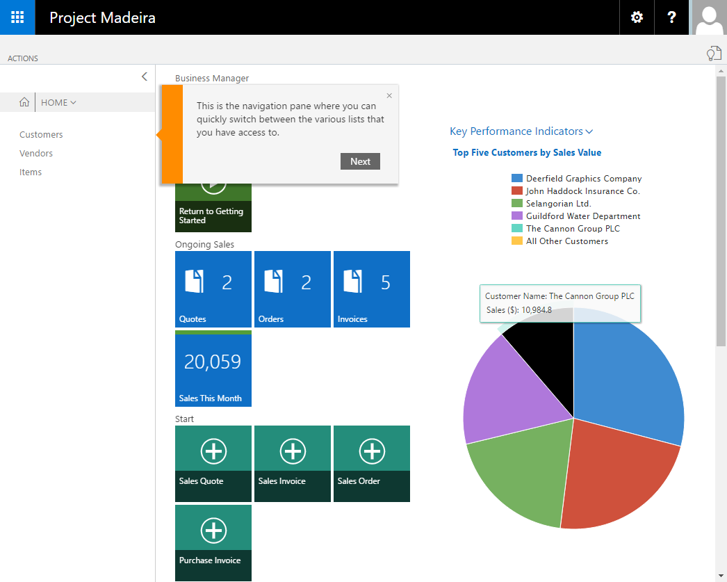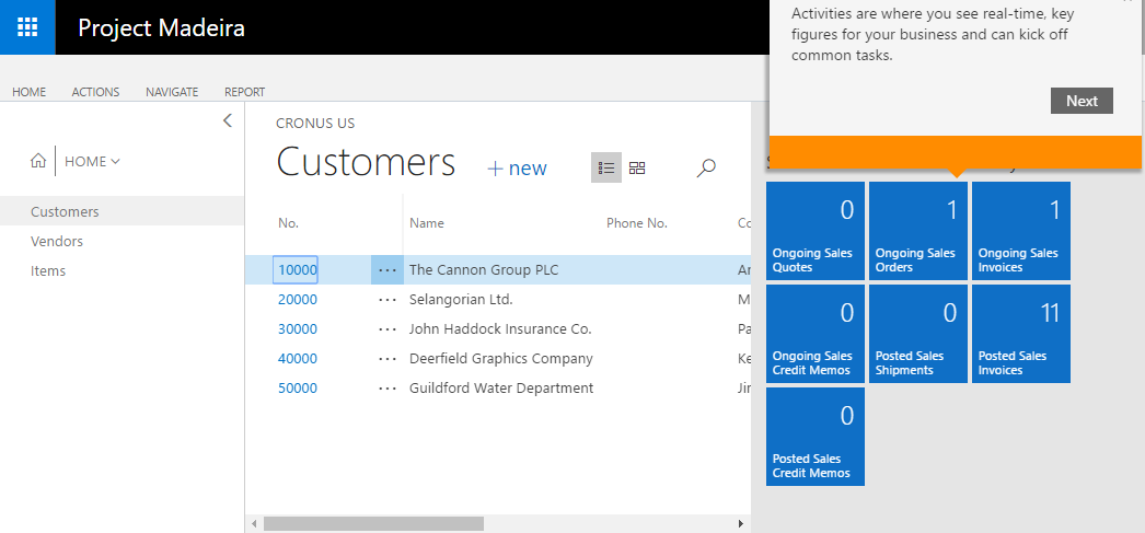 Danach erfolgt eine Weiterleitung zum Office 365 Tenant in dieser Art: https://[tenantname].projectmadeira.com/MS/WebClient/?company=CRONUS%20US. Das Dashboard präsentiert sich wie hier. Popups informieren über die ersten Schritte.