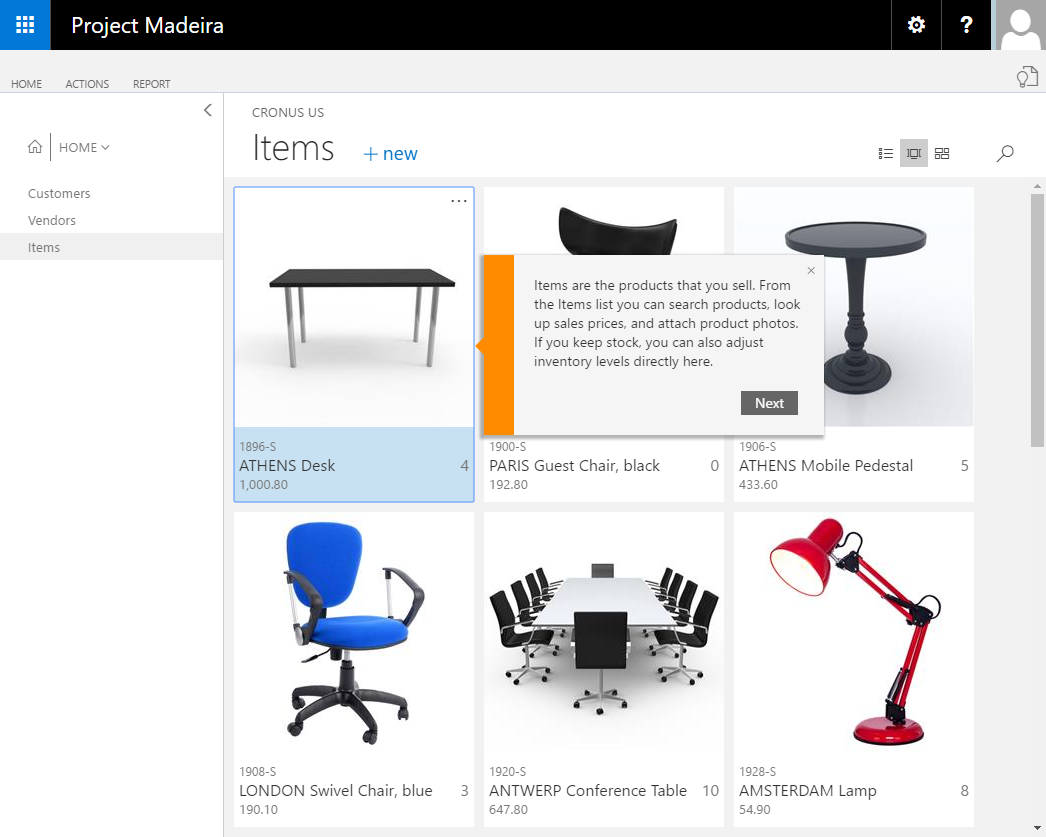 Zunächst empfiehlt ein Popup, Artikel (“Items”) anzulegen. Netterweise gibt es hier bereits einige Artikel – als Unternehmen “Cronus US” verkaufen wir hier Möbel…