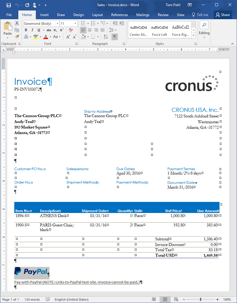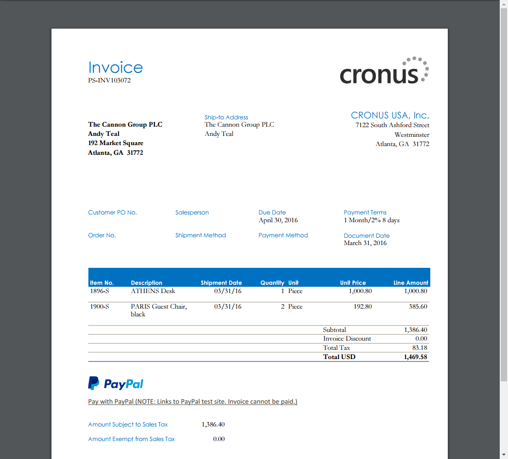 Mit “Post” bzw. “Post and Send” wird die Rechnung abgesendet (natürlich wird die erforderliche SMTP Konfiguration und korrekten Kunden-Kontaktdaten vorausgesetzt). Danach wird die Rechnung abgeschlossen und kann nicht mehr geändert werden. Die Rechnung wird als PDF erzeugt, “Preview” zeigt diese an. Diese sieht dann recht ansprechend aus, oder?