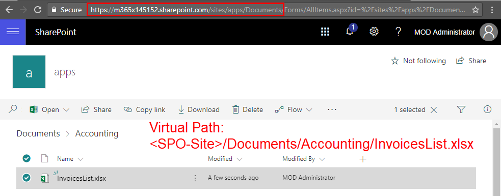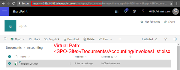 So, the virtual path is [SPO-Site]/Documents/Accounting/InvoiceList.xlsx.
