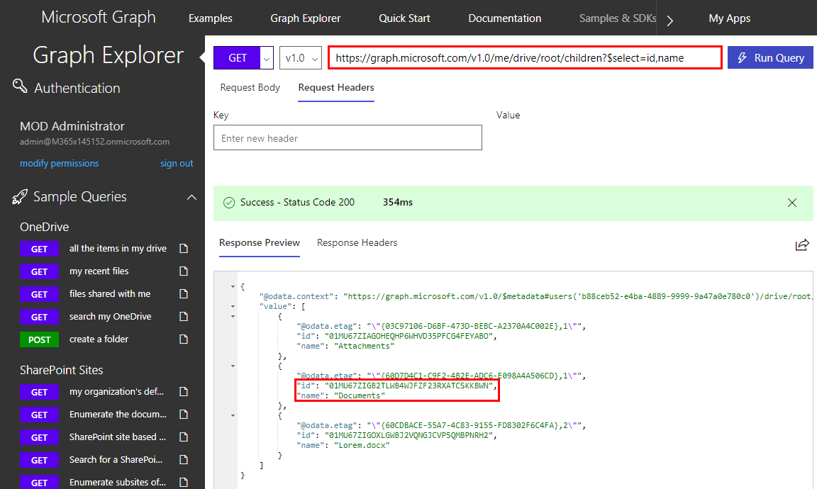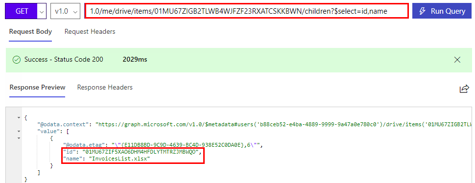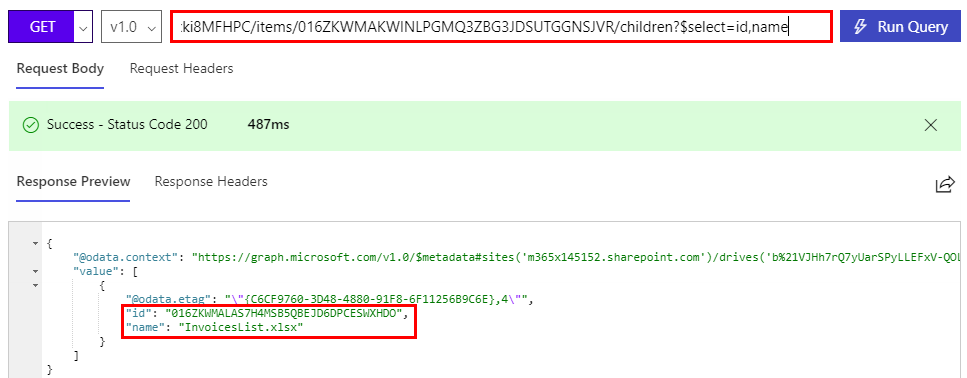 My target file is stored in the Documents folder with ID 01MU67ZIGB2TLWB4WJFZF23RXATCSKKBWN… to access all objects in a folder, we can use the drive/items method followed by the container ID. To see the content we add then children method: