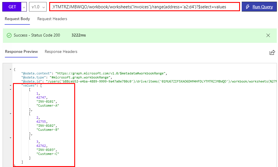 https://graph.microsoft.com/v1.0/me/drive/items/01MU67ZIF5XAO6DHM4HFDLYTMTRZJMBWQO/workbook/worksheets('Invoices')/range(address='a2:d4')?$select=values