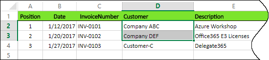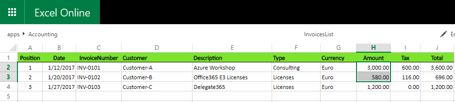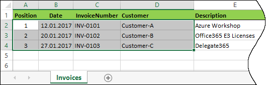 Ok, now it’s simple. We can use the Excel REST API to read the content. You can step through each method and see the result (f.e., the collections of worksheets), but here I directly access some cells of the first data sheet named “Invoices”: