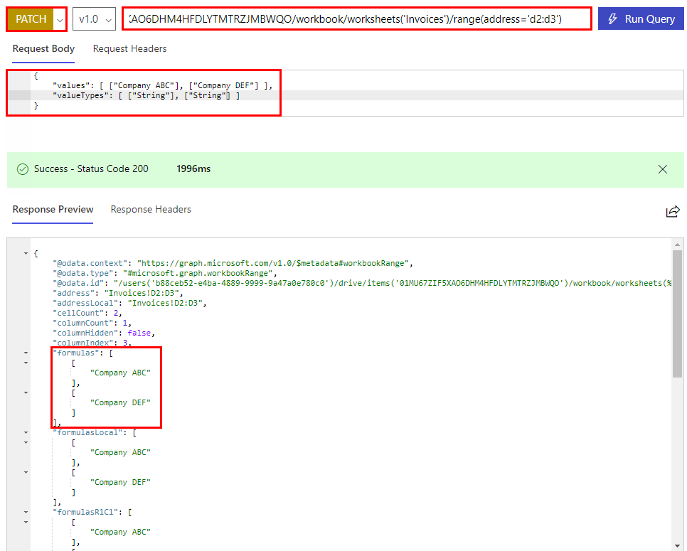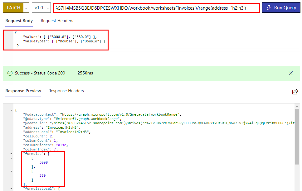 https://graph.microsoft.com/v1.0/me/drive/items/01MU67ZIF5XAO6DHM4HFDLYTMTRZJMBWQO/workbook/worksheets('Invoices')/range(address='d2:d3')