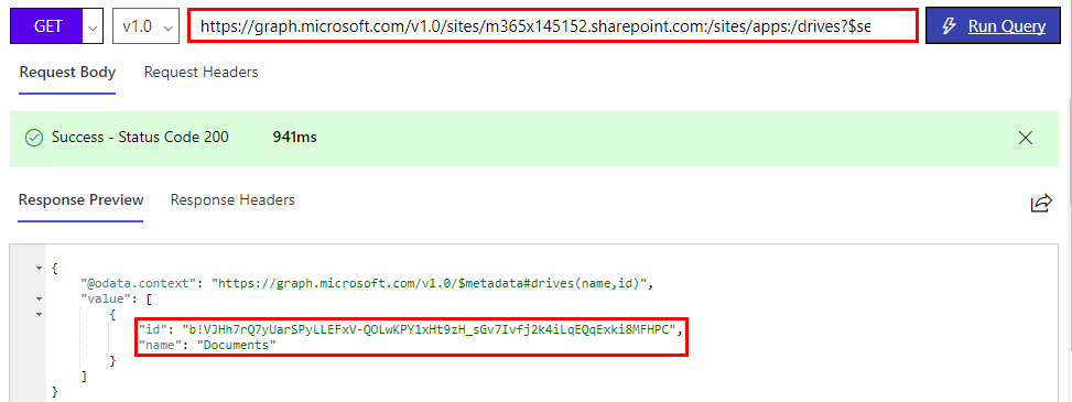 https://graph.microsoft.com/v1.0/sites/m365x145152.sharepoint.com:/sites/apps:/drives?$select=name,id