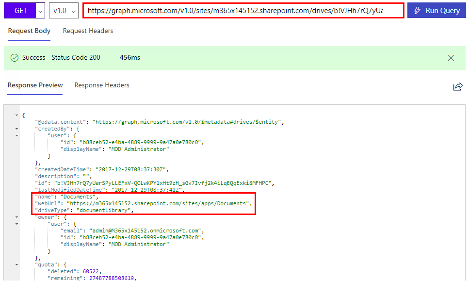 So, now we have the document library ID of “Documents” which is b!VJHh7rQ7yUarSPyLLEFxV-QOLwKPY1xHt9zH_sGv7Ivfj2k4iLqEQqExki8MFHPC. Just for completeness, to access the document library properties, we can use: