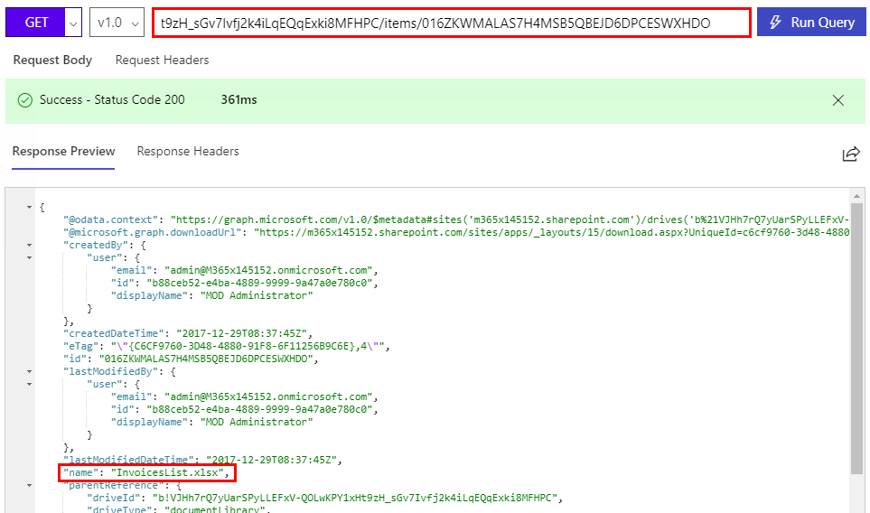 So, we see there’s one item in that folder. Now we get the Document ID of InvoicesList.xlsx which is 01MU67ZIF5XAO6DHM4HFDLYTMTRZJMBWQO.To see that specific file let’s use the document ID as here: