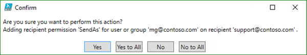 Add-RecipientPermission support@contoso.com -AccessRights SendAs -Trustee mg@contoso.com