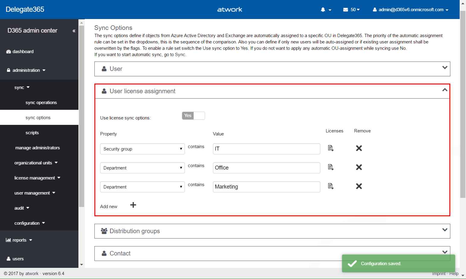 Delegate365 version 6.4 allows to automate custom license requirements. This is a powerful addition for auto license assignments within Delegate365. Now Office 365 licenses can be set by simply adding a user property to any custom value and by defining one or more conditions in the Sync options.