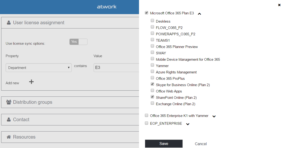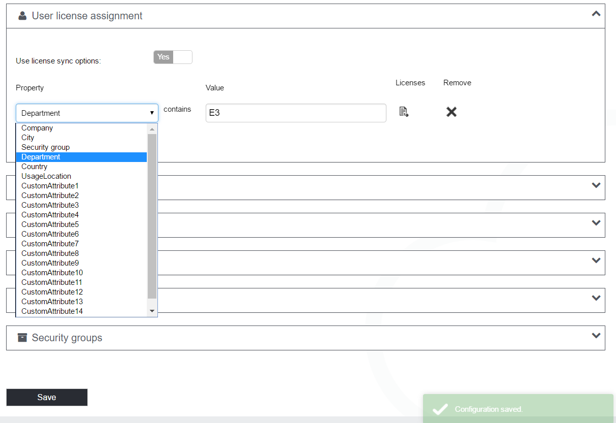 Click the Save button at the bottom to save all Sync options on that page. The configuration is persisted and will be used by the following Sync operations.Matching rules: The Sync options can be used for comparing user properties (as Department, CustomAttributes, etc.) or if the user is member of a security group as well – same as the user sync options for assigning to an OU. The value must be part of the selected property (upper and lowercase and spaces at the start or end are ignored) so the condition always says “contains”. So in this example, the condition works and will be executed, if the user property in department is set to “E1, E3, E5”, or “set license to e3 and e5” or simply “e3”. With that mechanism, administrators can create powerful automations for assigning any license set, defined by any custom value.