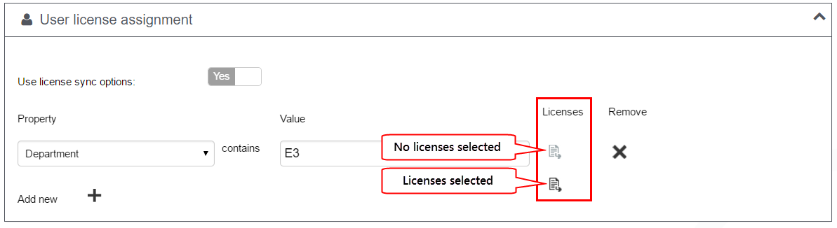 License selection: The Licenses icon visualizes if there are licenses selected or not. This helps to see at a glance if licenses will be added or not.