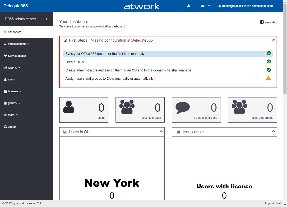 Once all requirements are satisfied, the First Steps box will no longer be visible (or show up again, if any requirement is missing). There is no manual method for switching the First Steps box on or off, it appears automatically to support the admin. Independently, Delegate365 checks if the connections to Azure Active Directory and Office 365 are valid as well. We think, this new feature makes sense in existing Delegate365 tenants and particularly in new ones.Quicker Dashboard: The dashboard now uses dynamic loading of the content to get a better user experience. So, the start page loads faster and shows the content when available. Small animated circles are shown until the boxes are able to show their content.